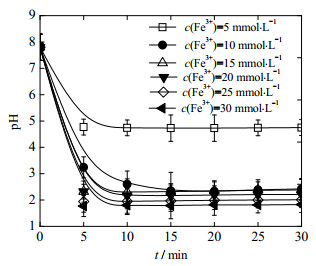 3.6 反应机理分析为分析Fe3+/H2O2类芬顿体系的降解反应机理,对Fe3+/H2O2类芬顿降解OPD污水过程中溶液pH值的变化情况、Fe3+/H2O2类芬顿体系与Fe2+/H2O2经典芬顿体系降解OPD污水过程的pH适应性进行对比。如图 6所示为不同Fe3+投加浓度下Fe3+/H2O2类芬顿降解OPD污水过程中溶液pH值变化规律,反应条件:OPD污水浓度为0.04 mol·L-1,pH=7.8,θ0=30 ℃;H2O2投加浓度为0.2 mol·L-1,Fe3+投加浓度范围为5~30 mmol·L-1,药剂投加顺序为“H2O2+Fe3+”。