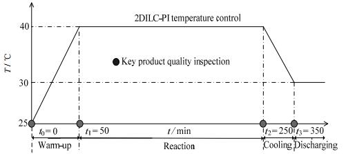 整个反应间歇过程包含预热、反应、冷却、出料等四个操作阶段,且在每个操作阶段温度控制要求都不同[16],例如在预热阶段,反应物A在初始时刻t0常温下一次性加入反应器中,开始预加热直到温度到达设定值(40 ℃);在反应阶段,以恒定进料流率F流加入反应物B直至反应结束,期间反应温度需控制维持在理想设定值,并将产物C最终质量维持在期望值,持续至反应物A完全耗尽,在冷却和出料阶段温度逐渐下降。本文根据间歇反应过程阶段操作特性,设计了间歇反应器的温度操作设定轨迹,如图 2所示。