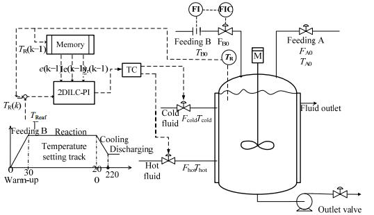 在上述两种反应组成的平行反应体系中,控制系统设计的重要目标是实现产品转化率和最终产品质量的一致性。产品质量控制可间接通过控制反应器温度跟踪预设轨迹来实现,在间歇补料反应操作过程中,考虑两个操作变量:冷流体和热流体流速。具体的控制结构如图 3所示。二维ILC-PI控制系统将冷热流体流速作为操作变量控制反应器内部温度,其他回路操作变量的控制采用传统PID来实现。