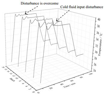 仿真运行结果表明,在第5批次内,冷流体输入扰动会在PI控制器作用下对闭环系统输出造成一定超调,但很快被抑制,同时通过批次间的迭代学习,后续批次的输入扰动造成的超调影响将逐批次减小。