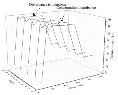 结果表明,进料B浓度对温度响应造成的扰动,会随着批次的迭代学习被很快克服,并且后续批次的浓度扰动造成的影响会随着批次间的迭代学习减小,至20批次时扰动的影响完全被消除。