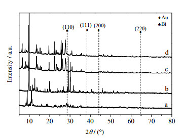 3 结果与讨论 3.1 催化剂表征图 1是催化剂1%Au-0.5%Bi/PMo11- BMo11/ZSM-5-m及ZSM-5-m、PMo11、BMo11的XRD图谱。其中图谱d除了在2θ=38.2°出现一个较小的Au特征峰(111)以及在2θ=28.5°处有一个偏小的Bi特征峰(110)之外,其余与图谱c没有非常明显的差异,这可能由于Au、Bi的负载量过低或者Au、Bi分散度高且颗粒小导致无法观察或只能观察到较小的特征衍射峰。对于金属多氧酸盐而言(图谱a、b),由于其主要特征衍射峰和ZSM-5-m有所重叠,且其负载量也不大,因此在图谱d中也无较明显的显示。