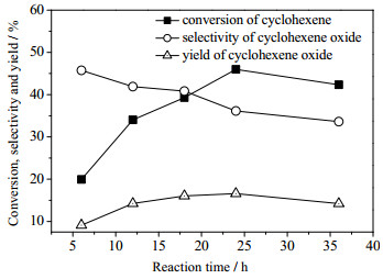 图 10 反应时间对分子氧催化环氧化效果的影响 Fig.10 Effects of reaction time on the epoxidation of cyclohexene |