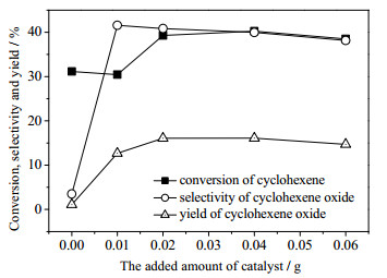 在反应温度80 ℃、压力0.5 MPa、环己烯2.0 g、3滴TBHP、反应时间18 h条件下,考察催化剂添加量对分子氧催化环氧化环己烯的影响,结果如图 11所示。由图可知,转化率、环氧环己烷选择性和收率均随着催化剂添加量的增大而出现先增加后趋于平缓的现象。其中环氧环己烷选择性变化最为明显,在催化剂添加量由0增加至0.01 g时,选择性由3.48%提升至41.6%。根据曲线图并综合考虑环己烯转化率、环氧环己烷选择性及催化剂成本,认为催化剂较合适的添加量为0.02 g。