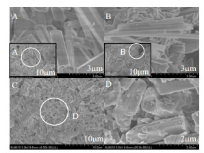 图 2 ZSM-5及催化剂1%Au/PMo11/ZSM-5-m的扫描电镜图 Fig.2 SEM micrographs of ZSM-5 and catalyst1%Au/PMo11/ZSM-5-m A. ZSM-5 B. ZSM-5-m C, D. 1%Au/PMo11/ZSM-5-m |