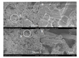 图 2和图 3分别是载体ZSM-5改性前后、催化剂1%Au/PMo11/ZSM-5-m和负载型金属多氧酸盐杂化催化剂1%Au-0.5%Bi/PMo11-BMo11/ZSM-5-m的扫描电镜图。由图 2可看到,ZSM-5改性前是形态较规整的条块状,而改性后则呈现片块状或层状,形态更薄,且表面出现褶皱不平整,更易于负载活性中心。由图 3也可见,ZSM-5表面出现小碎粒,说明催化活性中心已负载在催化剂上,且除了孔道以外,在表面也有一部分活性中心被负载。负载前后,ZSM-5的结构没发生改变,说明该负载方法不会对分子筛产生破坏。