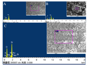 图 4是POMs和催化剂1%Au-0.5%Bi/PMo11-BMo11/ZSM-5-m的EDS光谱图。以图A为例可以看到,PMo11含有O、Na、P和Mo元素,且P和Mo的原子比为12.43,与11相接近。由C可以看到,1%Au-0.5%Bi/PMo11-BMo11/ZSM-5-m催化剂中含有B、P、Mo、O、Bi、Au、Si、Al、Na、K元素,说明催化活性中心已经负载在ZSM-5上了。