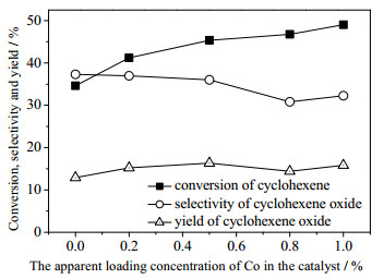 图 6 Co表观负载量对催化剂催化环氧化效果的影响 Fig.6 Effects of Co loading contents on the epoxidation of cyclohexene Reaction conditions: catalyst 0.02 g, cyclohexene 2.0 g, TBHP 3 drops, reaction pressure 0.8 MPa, temperature 80 ℃, reaction time 18 h. |