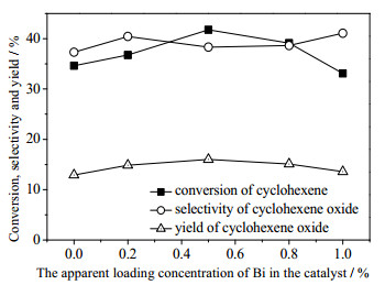 图 7 Bi表观负载量对催化剂催化环氧化效果的影响 Fig.7 Effects of Bi loading contents on the epoxidation of cyclohexene Reaction conditions: catalyst 0.02 g, cyclohexene 2.0 g, TBHP 3 drops, reaction pressure 0.8 MPa, temperature 80 ℃, reaction time 18 h |
