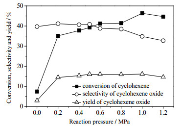 图 8 反应压力对分子氧催化环氧化效果的影响 Fig.8 Effects of reaction pressure on the epoxidation of cyclohexene (0 MPa does not mean vacuum, which means no oxygen added) |