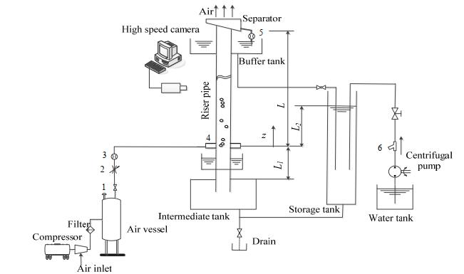 图 3 气力提升泵实验装置 Fig.3 Experimental apparatus of airlift pump 1. gate value 2. regulator value 3. gas turbine flowmeter 4. air injector 5. water turbine flowmeter 6. strainer |