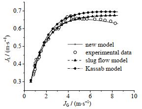 将该理论模型与弹状流模型进行对比分析,如图 7所示。单纯的弹状流模型在低进气工况下与实验数据吻合较好,但在高进气工况下,弹状流模型的计算结果与实验结果产生了较大的偏离。如图 7所示,在高进气工况下,根据弹状流模型计算的液相速度随进气量的增加缓慢增加,这符合弹状流的流动特征,随进气量增加,液柱长度变长,出口液流速度增大。而实际上,弹状流液柱长度存在极限值。随进气量增大,弹状流转变为搅拌流,气力提升泵的表观液流速度不随进气量增大而加快。