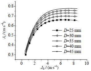 4.4 模型预测分析气力提升泵的管道直径对提升性能也有较大的影响。如图 8为管道直径分别为25、30、35、40、45 mm下气力提升泵的排水特性曲线。从数值计算结果可以看出,在低表观气流速度工况下(JG < 3 m·s-1),增大管径能略微提高气力提升泵的排水速度;而对于高表观气流速度工况(JG > 3 m·s-1),管径增加能明显提高气力提升泵的排水性能。气力提升泵在提升液体过程中需要克服液体的重力以及管壁摩擦力。对于高速流动的气液两相流,增大管径能有效降低管壁的摩擦效应。因此,对于实际工程应用,在高进气量下,不仅可通过增加浸入率提高系统性能,还可通过加大提升管直径提高系统排水速度。