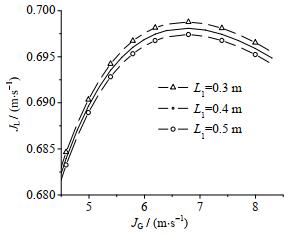 为探究浸入管长度对气力提升泵性能的影响,选取浸入管长度分别为0.3、0.4、0.5 m,对提升泵的理论模型进行计算。如图 9为不同浸入管长度对气力提升泵性能的影响曲线。对于低气流速度工况(JG < 6 m·s-1),浸入管长度对提升泵的液体表观速度影响不大,而对于高气流速度工况(JG > 6 m·s-1),浸入管长度能降低提升泵的液体表观速度。这是由于高速流动工况下,增加浸入管道长度加剧了液体的管壁摩擦损失。
