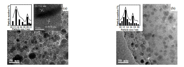 图 1 镍催化剂的TEM图和粒径分布;嵌图为催化剂金属的粒径分布和HRTEM图 Fig.1 TEM images and particles size distribution of the nickel-based catalysts. The inserted images are the metal particle size distribution and a HRTEM image (a) 5Fe-15Ni/AC-NaBH4 (b) 5Fe-15Ni/AC-NaBH4 after 8-time reuse |