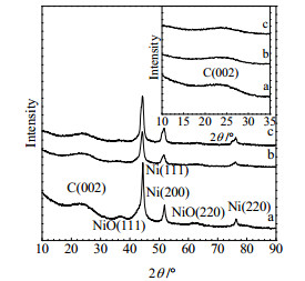 15Ni/AC、5Fe-15Ni/AC-NaBH4以及在苯酐加氢反应中重复使用8次后的5Fe-15Ni/AC-NaBH4的XRD表征结果如图 2所示。曲线a中2θ=23.5~24.0°处强度较弱的宽峰对应于AC (002)晶面的衍射峰(JCPDS-ICDD Card No.41-1487)。在活性炭经过NaBH4改性后,该特征衍射峰右移至24.5°处(曲线b和c,图 2),说明AC-NaBH4仍然具有石墨结构[26, 27],特征峰的右移可能是由于NaBH4除去了活性炭中的含氧基团[28]。