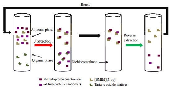 本文基于本组之前的研究工作[30],以[Bmim][L-Trp]和酒石酸酯为萃取剂开发了双相识别手性液液萃取体系并用于氟比洛芬对映体的分离。考察酒石酸酯种类及浓度,药物浓度,有机溶剂种类,pH,温度等因素对于萃取过程的影响,并通过反萃取过程进行了手性离子液体的循环回用研究。