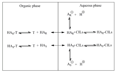 图 3 氟比洛芬萃取机理 Fig.3 Mechanism of flurbiprofen extraction HAR and HAS: R-flurbiprofen and S-flurbiprofen molecules AR-and A: R-flurbiprofen and S-flurbiprofen ionics T and CILs: tartaric acid derivatives and chiral ionic liquids |