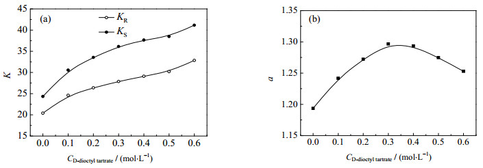 图 4 D-酒石酸二辛酯浓度对分配系数(a)和选择性系数(b)的影响 Fig.4 Effects of D-dioctyl tartrate concentrations on distribution coefficients (a) and enantioselectivity (b) |