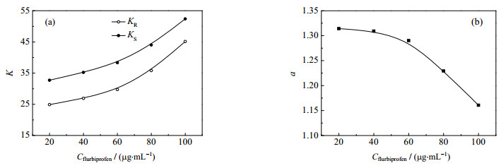 图 6 初始氟比洛芬消旋体浓度对分配系数(a)和选择性系数(b)的影响 Fig.6 Effects of initial racemic flurbiprofen concentrations on distribution coefficients (a) and enantioselectivity (b) CD-Dioctyl tartrate = 0.3 mol·L-1, C[BMIM][L-trp] = 0.02 mol·L-1, pH = 2.0, 25 ℃, solvent: ClCH2CH2Cl |