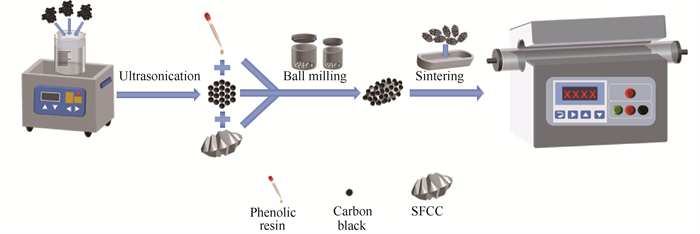 2.2 莫来石-方石英陶瓷/碳复合材料的制备陶瓷/碳复合材料的制备示意图如图 1所示。将SFCC放入到球磨罐中。按照不同质量分数(0、6%、7%、8%、9%、10%)称取炭黑放入烧杯中,将无水乙醇加入烧杯中使炭黑充分浸润。滴加质量分数为2% 的酚醛树脂(作为有机粘结剂)到烧杯中,并放入超声清洗机中在60 KHz下超声1 h。将超声后的炭黑转移到球磨罐中,与SFCC混合均匀。以氧化铝为球磨介质,在400 r·min-1的转速下球磨12 h。将球磨后的物料放入烘箱中在70 ℃干燥6 h,得到莫来石-方石英陶瓷/碳吸波复合材料的前驱体。