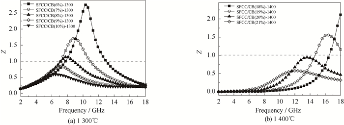 不同温度烧结得到的陶瓷/碳复合材料的阻抗匹配如图 10所示。阻抗匹配Z代表着电磁波能够进入材料内部的能力,用式(8)进行计算[34]。