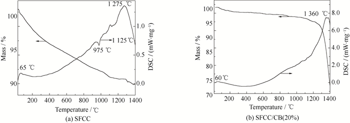 3 结果与讨论 3.1 SFCC与前驱体的TG-DSC分析图 2为SFCC和SFCC/CB(20%)-1400的TG-DSC曲线。图 2(a)表明随着温度的逐步升高,SFCC的质量逐渐减少。SFCC的DSC曲线在65 ℃处出现的吸热峰,代表SFCC中吸附水的去除[12]。975 ℃的放热峰代表初生莫来石相的形成[13]。随着温度的升高,有更多莫来石相生成。1 125 ℃的放热峰表明,SFCC中的非晶态的二氧化硅转化为晶态的方石英相。随着温度的进一步升高,在1 275 ℃出现新的吸热峰,说明二次莫来石相形成[14]。从图 2(b)可以看出,SFCC/CB(20%)的质量也随着温度的升高而减少。在60 ℃出现的吸热峰对应SFCC/CB(20%)中吸附水的脱除。温度升高至1 300 ℃时,图中并没有出现明显的吸热或放热峰,可能是由于碳含量过高,抑制了SFCC中原本的莫来石化反应[15]。在1 360 ℃出现的吸热峰,代表着碳热还原反应生成碳化硅[16]。