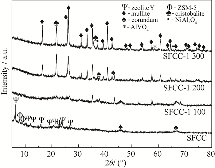 图 3为SFCC以及其经过1 100~1 300 ℃梯度温度烧结后的XRD图。由图 3可知,SFCC主要由分子筛Zeolite Y和ZSM-5组成。SFCC经高温烧结后,分子筛Zeolite Y和ZSM-5的结构发生破坏。在1 100 ℃时出现了方石英或莫来石的衍射峰。但莫来石衍射峰较宽且较弱,表明复合材料中生成的初生莫来石含量低且结晶度较差。提升烧结温度后,莫来石的衍射峰强度升高,并且出现的莫来石衍射峰更加明显和对称。在1 200 ℃时,在2θ=26.0°附近出现d(210)和d(120)两个莫来石衍射峰[13]。当升高到1 300 ℃时,方石英相的衍射峰变弱,而刚玉的衍射峰消失不见。这是由于刚玉与方石英反应转化为莫来石后,剩下的方石英转变为非晶相[17],与TG-DSC的分析结果(图 2(a))一致。SFCC经过烧结转化为莫来石-方石英复合陶瓷相,而SFCC中含有的有害重金属V2O5与NiO经过高温烧结转化为了AlVO4和NiAl2O4尖晶石,实现了有害重金属氧化物的固定,达到了对SFCC无害化处理的目的[18-19]。