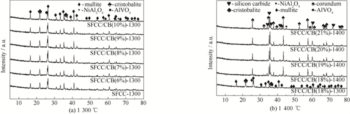 图 4 在1 300 ℃和1 400 ℃烧结制备陶瓷/碳复合材料的XRD图 Fig.4 XRD patterns of ceramic/carbon composites prepared by sintering at 1 300 ℃ and 1 400 ℃ |