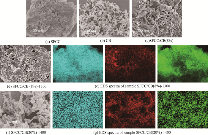 3.3 SEM图分析SFCC、炭黑、SFCC/CB(8%)、SFCC/CB(8%)-1300和SFCC/CB(20%)-1400的SEM图和EDS图如图 5所示。