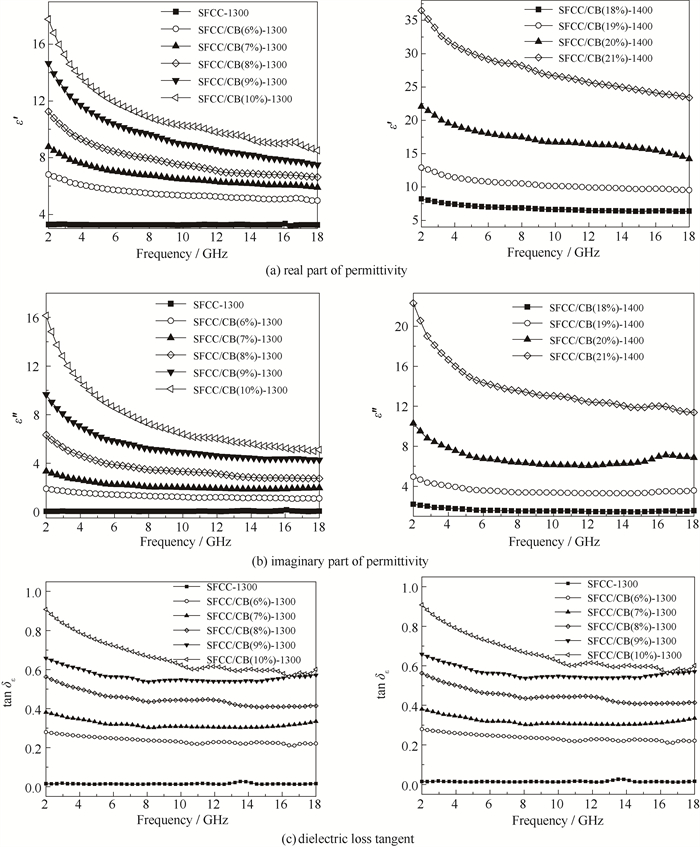复介电常数的实部和虚部分别反映了复合材料对电能的存储性能和耗散性能,而损耗正切值代表着复合材料对电能的实际耗散能力[6]。由图 6(a)~(c)分析可知,SFCC经过烧结后形成的莫来石-方石英复合陶瓷相的复介电常数,其实部接近于1,虚部接近于0,且在整个频率范围内几乎不随着频率的增加而发生波动,说明复合陶瓷相几乎不具有极化损耗和电导损耗能力。相比于SFCC-1300,通过球磨在SFCC表面负载炭黑后,再经过烧结制备的陶瓷/碳复合材料,其复介电常数的实部、虚部以及损耗正切值都有所提高,且随着炭黑负载量的增加而逐渐升高。这是由于随着炭黑负载量的增加,陶瓷/碳复合材料的导电性也有所提高,同时出现大量的炭黑与陶瓷相的异质界面,进而增强了复合材料中的极化损耗和电导损耗能力。复合材料的复介电常数在2~18 GHz整个频率内,都随着频率的升高呈现下降趋势。这种现象被认为是碳材料中表现出的典型频率色散行为,也是偶极极化的标志,有益于增强复合材料的电磁波吸收性能[25]。但如果复合材料复介电常数过大,会引起复合材料的阻抗匹配失衡,使得电磁波在经过其表面时发生较多的反射而无法进入材料内部,阻碍了对电磁波的吸收[26]。图 6(a)~(c)表明,经过1 400 ℃烧结制备的碳化硅-刚玉陶瓷/碳复合材料,其复介电常数随着频率变化的规律与莫来石-方石英陶瓷/碳复合材料相似。碳化硅-刚玉陶瓷基体的复介电常数比莫来石-方石英陶瓷基体更高,这是由于碳化硅属于半导体,本身具有一定的导电性,表现出更高的复介电常数[27]。
