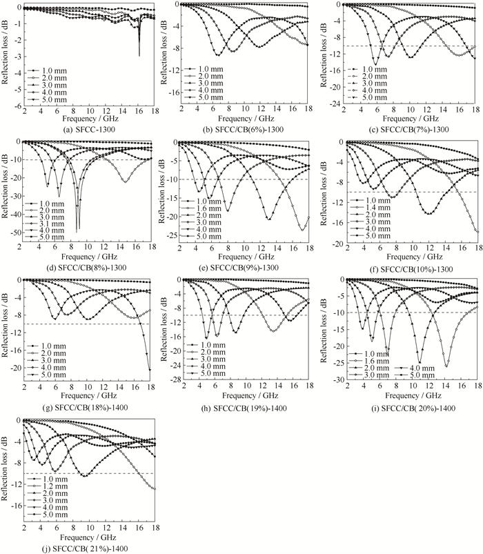 阻抗匹配的优劣决定电磁波在经过材料表面时是发生反射还是进入到材料内部。当阻抗匹配的值无限接近于1时,表明复合材料阻抗匹配优异,电磁波在材料表面发生较少反射,大量的电磁波得以进入材料内部来发生损耗[35]。由图 10可见,匹配厚度d为3.1 mm时,样品SFCC/CB(8%)-1300的阻抗匹配更接近于1。这表明在1 300 ℃下所制备的莫来石-方石英陶瓷/碳复合材料中,样品SFCC/CB(8%)-1300具有最好的阻抗匹配。此外,在1 400 ℃下所制备的碳化硅-刚玉陶瓷/碳复合材料中,匹配厚度d为1.6 mm时,样品SFCC/CB(20%)-1400的阻抗匹配更接近于1。这表明在所制备的碳化硅-刚玉陶瓷/碳复合材料中,SFCC/CB(20%)-1400具有最好的阻抗匹配。结合前面对复介电常数的分析可知,过高的炭黑负载量会使得陶瓷/碳复合材料的复介电常数较大,造成陶瓷/碳复合材料的阻抗匹配失配而偏离1。