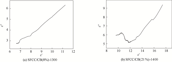 样品SFCC/CB(8%)-1300和SFCC/CB(20%)-1400的科尔-科尔曲线如图 8所示。陶瓷/碳复合材料对电磁波的损耗主要来自于介电损耗,其中的界面极化损耗可以由科尔-科尔曲线表示。利用德拜弛豫模型可以对样品介电损耗机理进行更深入的分析。根据德拜弛豫理论,当电磁波与材料相互作用时,如果科尔-科尔曲线出现半圆部分,则代表着材料内部存在着极化过程,对电磁波造成极化损耗[31]。由图 8(a)~(b)可知,样品SFCC/CB(8%)-1300与SFCC/CB(21%)-1400的科尔-科尔曲线中均出现了多个半圆,说明在陶瓷/碳复合材料的内部存在着大量的界面极化现象。当入射电磁波作用在陶瓷/碳复合材料上时,不同组分的介电性能和电导率的存在差异,在一定程度上阻碍电子在非均质界面上的传递。因此,大量电子被限制在炭黑与陶瓷基体之间的界面区域,导致异质电荷积聚,进而造成界面极化现象[32]。