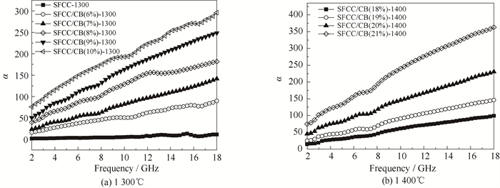 衰减常数α能够反映出复合材料对电磁波衰减能力的大小,通过式(7)计算获得[33]。由图 9(a)~(b)可知,由于SFCC经过烧结后形成的莫来石-方石英复合陶瓷相没有导电性为透波相,衰减常数接近于0,说明其对电磁波不具有衰减能力。随着炭黑负载量的提高,样品的衰减常数逐渐增加,说明样品对电磁波的衰减能力也在提高[5],这是由于炭黑负载量的增加提高了陶瓷/碳复合材料的介电损耗,进而提升了复合材料的对电磁波的衰减能力。在碳化硅-刚玉/碳复合材料中,衰减常数随炭黑负载量的变化呈现出相同的规律,这一结果与上述复介电常数的分析结果一致。