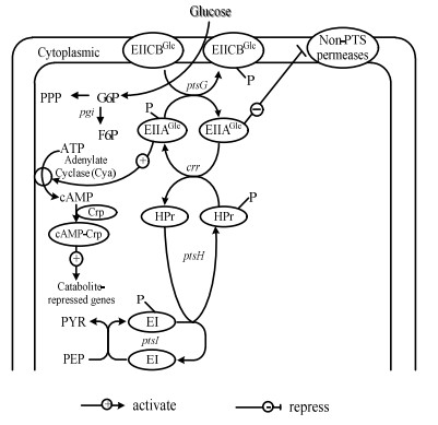图 1 大肠杆菌的分解代谢物阻遏机制 Fig.1 Mechanisms of carbon catabolite repression in E.coli.