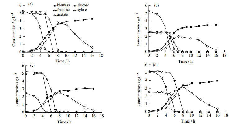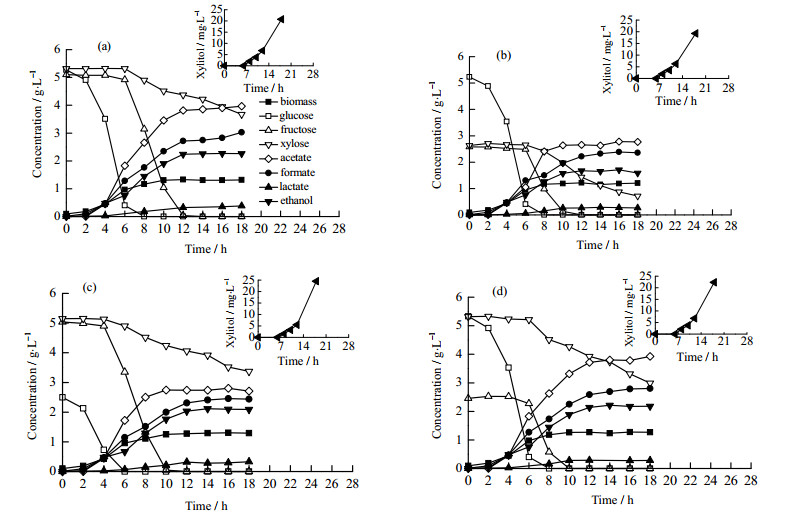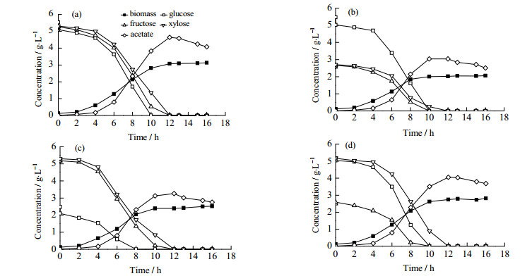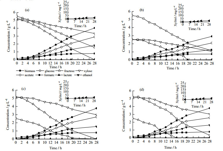 图 4 E.coli BW25113以不同比例葡萄糖、果糖和木糖为混合碳源在厌氧条件下分批发酵结果 Fig.4 Results of batch anaerobic cultivation of E. coli BW25113 using a mixture of glucose, fructose, and xylose as the carbon source (a) glucose 5 g·L-1, fructose 5 g·L-1, xylose 5 g·L-1  (b) glucose 5 g·L-1, fructose 2.5 g·L-1, xylose 2.5 g·L-1  (c) glucose 2.5 g·L-1, fructose 5 g·L-1, xylose 5 g·L-1  (d) glucose 5 g·L-1, fructose 2.5 g·L-1, xylose 5 g·L-1