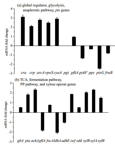课题组前期的研究结果发现,在E. coli BW25113在厌氧培养条件下,小部分木糖被还原成木糖醇,木糖醇会被果糖PTS系统磷酸化形成木糖醇-5-磷酸(高于阈值15.2 mg·L-1),抑制菌体生长;在E. coli BW25113crp+在厌氧培养条件下产生少量木糖醇,不足以抑制菌体生长[13]。本研究中,E. coli BW25113 △pgi在厌氧条件下,葡萄糖、果糖和木糖同时开始被消耗,但只产生了低浓度的木糖醇,抑制菌体生长的效果不显著。上述结果可能是由于E. coli BW25113 △pgi在单位时间内消耗的果糖量低于野生型,不足以诱导木糖醇形成抑制菌体生长的木糖醇-5-磷酸。此外,与野生型相比,E. coli BW25113 △pgicyaAcrp转录水平增加,分解代谢阻遏一定程度上被解除,木糖以木酮糖-5-磷酸的形式进入磷酸戊糖途径的流量增加,由此减少了由木糖还原产生的木糖醇的量。在基因转录水平(图 6),xylR及其调控编码木酮糖异构酶的xylA和编码木酮糖激酶的xylB的转录水平增加也证明这一点。