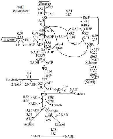 图 7 E. coli BW25113和E. coli BW25113 △pgi以葡萄糖、果糖和木糖为混合碳源在厌氧条件下以0.1 h-1为稀释率进行连续培养的代谢流量分布 Fig.7 Metabolic flux distributions of wild type E. coli BW25113 and △pgi mutant in continuous anaerobic culture using a mixture of glucose, fructose, and xylose as the carbon source under dilution rate of 0.1 h-1