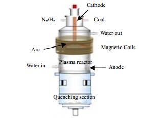 反应器为一个旋转弧等离子体炬[11],反应器内安装一个金属片作为电极阴极,反应器壁面为电极阳极,反应器外壁缠绕线圈,通过线圈的电流控制反应器内部磁场和电弧,反应器内部等离子体旋转弧高速扫射在反应器内壁形成等离子体面,反应器示意图如图 1所示: