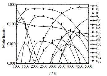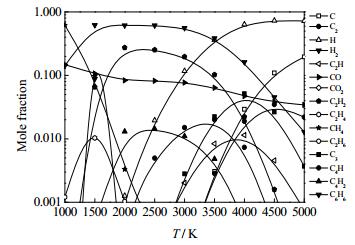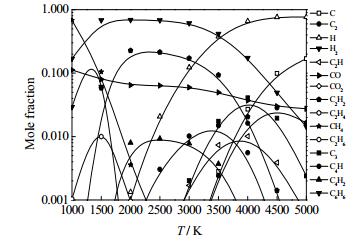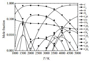 由图 2~5可知,在1000~5000 K,热力学平衡时,乙炔的浓度先增加后减小,主要组分(H2、CO、C2H2)浓度在1400~1800 K与实验出口组成接近。