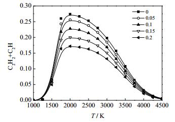 图 6 不同含水率对应的乙炔收率-温度关系热力学计算图 Fig.6 Thermodynamic simulation diagram of yield mole fraction- temperature relationship of acetylene under different water contents |