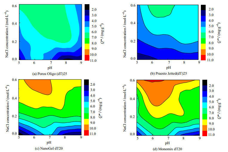 图 1 不同pH和NaCl浓度条件下4种亲和层析介质对poly(A)的Q*比较 Fig.1 Poly(A) adsorption capacities of the four affinity resins under different pH and NaCl concentrations |