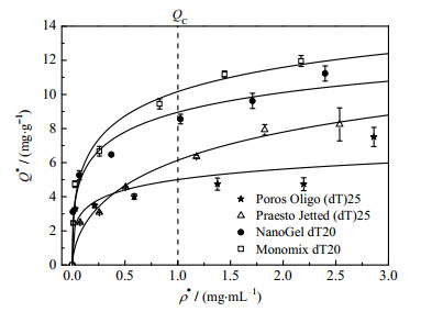 由表 2可见,Poros Oligo (dT)25和Praesto Jetted(dT)25这2种亲和层析介质的静态吸附容量较低(QC分别为4.9和6.1 mg⋅g−1),这可能是由于其dpore相对较大,导致其可及吸附表面积减小。由表 2还可见,相比于其他3种亲和层析介质,Praesto Jetted(dT)25的K值(0.578) 最小,且QC/Qm值小于40%,需要更高的poly(A) 质量浓度来达到较大的Q*值,可能是介质的配基密度、间隔臂等因素导致其对poly(A)的亲和力较弱。由图 2可见,当ρ*较高时(ρ* > 2.86 mg⋅mL−1),Poros Oligo (dT)25介质的Q*有较大幅度增大,这说明高ρ*值可能导致吸附机理发生改变[21]。