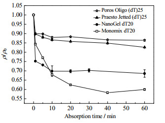由图 3可见,Poros Oligo (dT)25、Praesto Jetted(dT)25和NanoGel dT20这3种亲和层析介质吸附poly(A)过程中,ρ/ρ0变化主要集中在前1 min。经推测,介质与poly(A)结合主要为对流传质主导的微球表层吸附,而微球内部扩散传质主导的孔内吸附较少,因而传质阻力小,达到吸附平衡所需时间短。由图 3还可见,Monomix dT20吸附poly(A)过程中,ρ/ρ0的大幅度变化持续了约20 min,40 min后趋于稳定,达到吸附平衡。这表明,在Monomix dT20介质中可能同时存在poly(A)的表层吸附和深层孔扩散吸附,而微球内部传质阻力较大,达到吸附平衡时间较长。相比于其他3种介质,dpore最小的Monomix dT20介质中存在poly(A)的深层孔扩散吸附,可能与其聚甲基丙烯酸酯的基质材料有关。由图 3还可见,在前1 min内,NanoGel dT20介质溶液的ρ/ρ0变化最大,可能是由于该介质的配基链长、间隔臂长度等因素导致介质与poly(A)的亲和性更强;此外,配基密度高也可使该介质吸附poly(A)分子多。