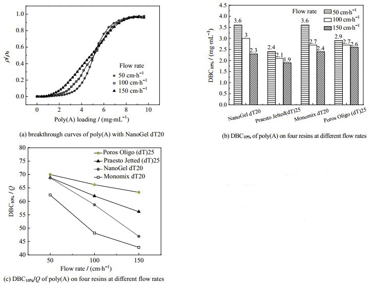 由图 4(b)、(c)可见,NanoGel dT20和Monomix dT20这2种亲和层析介质对poly(A)的DBC10%值较高,且受流速影响较明显,DBC10%/Q随流速增加而大幅度下降。由前文可知,Monomix dT20的Q值比NanoGel dT20高,但图 4(b)显示DBC10%值却与NanoGel dT20接近,可能由于Monomix dT20介质的dpore相对较小,大部分poly(A)分子由于停留时间短、扩散传质阻力大等原因而未能扩散至介质微球内部孔中,仅在微球表层吸附,导致DBC10%没有明显高于NanoGel dT20;而且,随着流速增大,Monomix dT20介质中的poly(A)的扩散时间缩短,导致其DBC10%/Q大幅度下降。而NanoGel dT20仅依靠微球表层的poly(A)吸附就能达到较高的DBC10%值,这可能与其具有比Monomix dT20稍大的dpore、较小的扩散传质阻力、较大的可及吸附表面积有关,此外配基密度、配基长度和间隔臂等性质也会影响其DBC10%,该结果与3.3节的推论相符。至于NanoGel dT20的DBC10%/Q受流速影响较大,分析原因可能是由于介质配基密度较高,导致基球带电荷量较大,对poly(A)的静电排斥力更强,影响了配基对poly(A)的吸附动力学,故传质阻力更大,吸附所需时间更长。正如Vanjur等[31]报道,固定在表面的DNA探针密度会影响其与目标互补链的静电斥力,改变吸附平衡和吸附动力学。