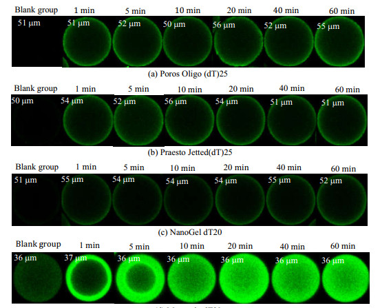 由图 5(a)~(c)可见,绿色荧光主要分布在介质微球表层,表明poly(A)主要吸附在Poros Oligo (dT)25、Praesto Jetted(dT)25和NanoGel dT20这3种亲和层析介质的外表层,且1 min之后荧光强度没有明显变化,与3.3节结果一致,可能原因是具有较大dpore的聚苯乙烯微球内部存在较多狭窄孔道,从而阻碍了poly(A)的微球内部孔扩散。对于Monomix dT20介质(见图 5(d)),随着吸附时间延长,荧光呈环状逐渐向内扩展,表明poly(A)逐渐扩散至微球内部;20 min后微球荧光强度分布基本稳定,达到吸附平衡,与3.3节的吸附动力学变化规律一致。