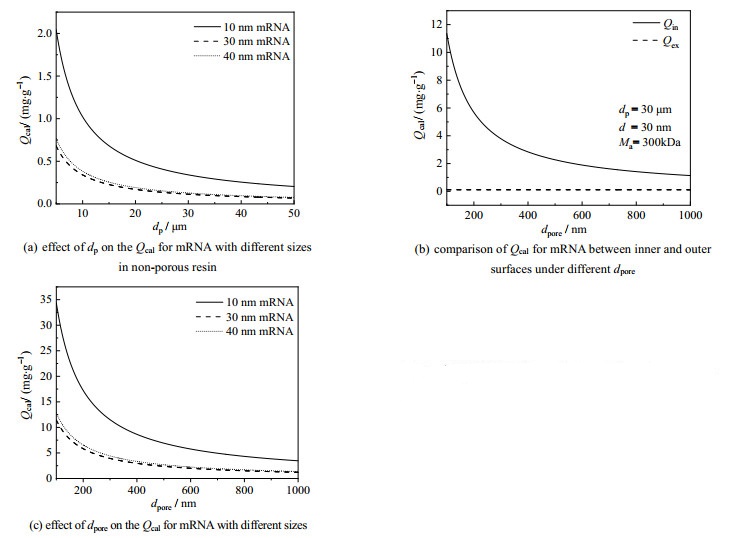 2.7 静态吸附容量理论计算以典型的分子大小和平均分子量的mRNA(10 nm和100 kDa,30 nm和300 kDa,40 nm和600 kDa)为模型分子,忽略mRNA分子间的相互作用力和传质阻力,只考虑mRNA水力学直径的影响,并在单分子层吸附前提下,模拟计算亲和层析介质对mRNA的静态吸附容量Qcal(mg⋅g−1),分析dp和dpore对Qcal的影响,并比较多孔微球对mRNA的内表面静态吸附容量Qin和外表面静态吸附容量Qex。计算式如下[28]: