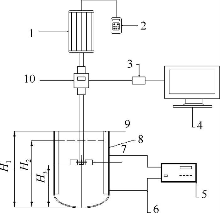图 1 搅拌实验装置 Fig.1 Schematic diagram of the mixing setup 1-motor 2-frequency modulator 3-data acquisition 4-computer 5-thermometer 6-thermocouple 7-blade 8-stirring tank 9-baffle 10-torque sensor |