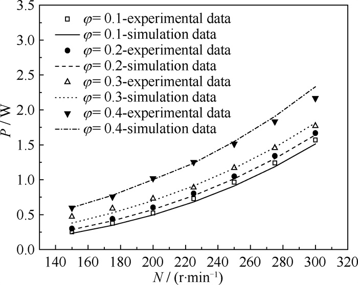 4 结论通过实验和模拟相结合的方法,在甘油-PMMA悬浮液体系黏度测量实验的基础上提出固-液两相体系的黏度模型,并将其与多相流Mixture模型相结合,对搅拌釜内高固含率下固-液两相体系的搅拌功率进行模拟预测,得到以下结论。