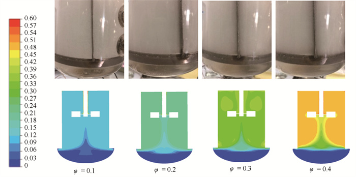 3.2.2 固相分布以及固含率测量结果进行黏度修正后的Mixture模型应用于固-液两相体系进行数值模拟的可靠性,也能进一步通过固相分布的模拟与实验结果对比来进行验证。图 11为转速为150 r ·min-1且固含率在0. 1~0. 4时,固相分布的模拟与实验结果的对比情况。